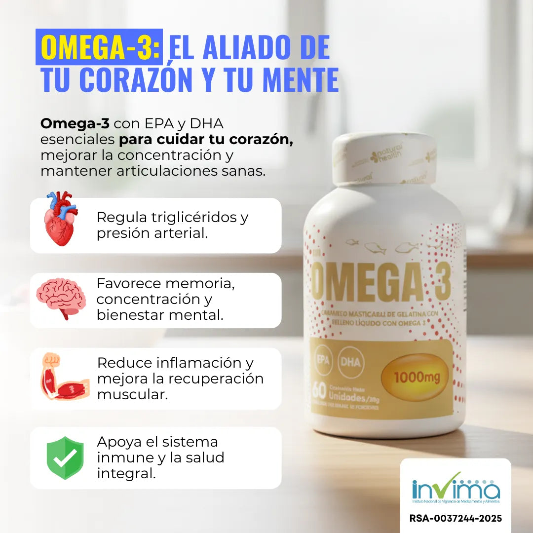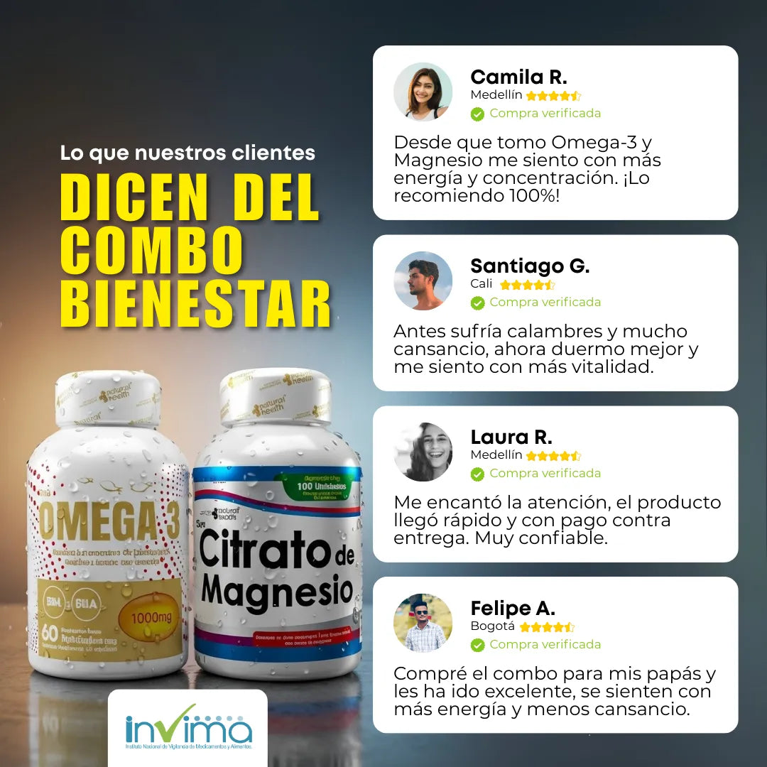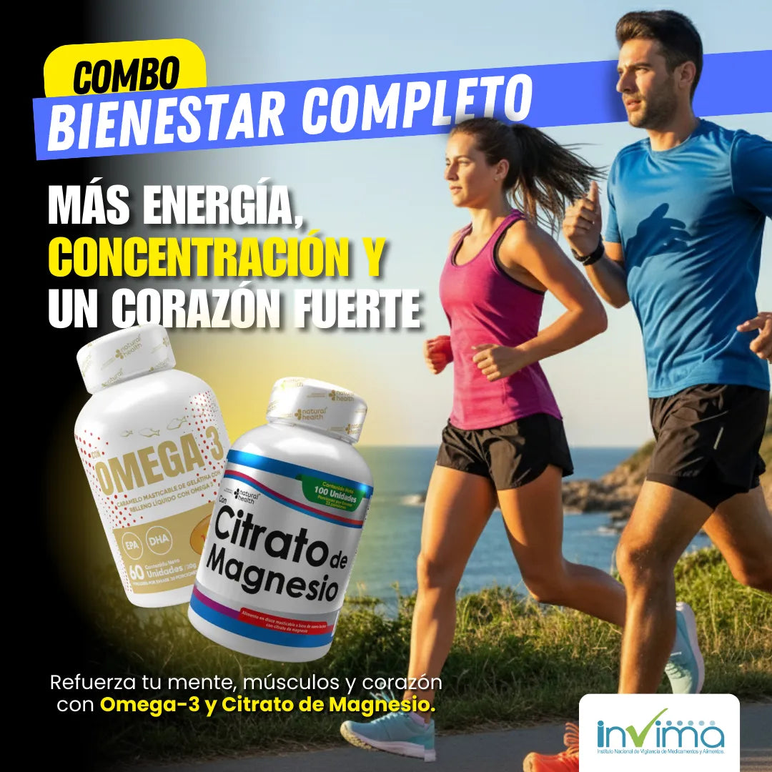 Ambos se complementan: el Omega-3 apoya la salud del corazón y el cerebro, mientras que el Citrato de Magnesio mejora energía, músculos y sistema nervioso. Juntos potencian tu bienestar general.